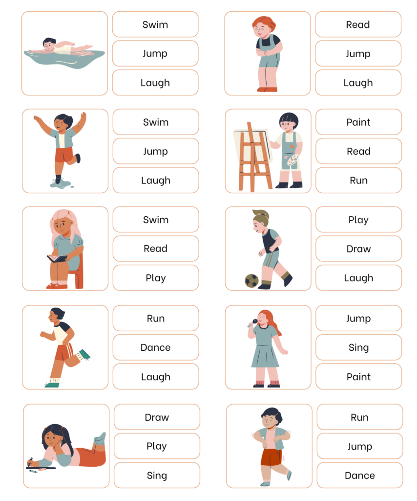 Words: run, eat, swim, dance, read, sleep, jump, draw, sing, cry
